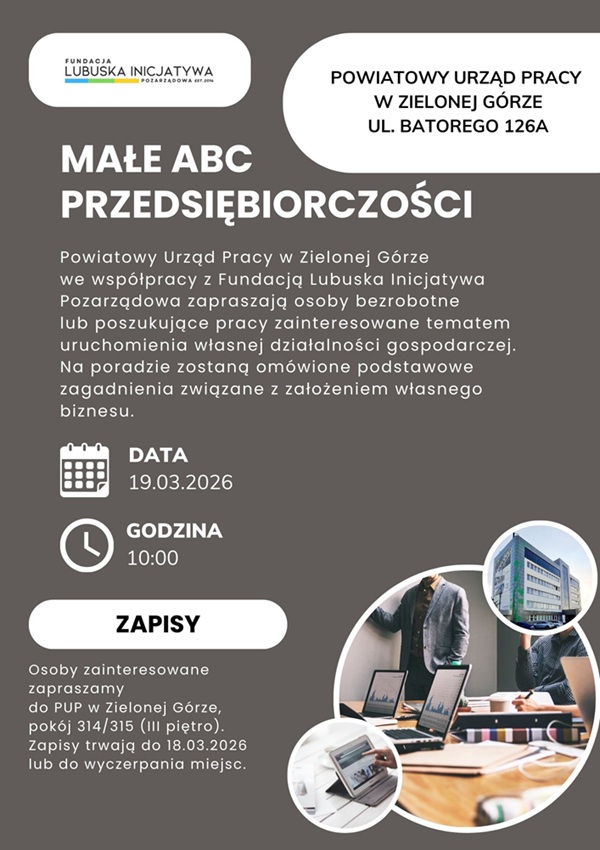 Powiatowy Urząd Pracy w Zielonej Górze zaprasza osoby pozostające bez pracy na spotkanie informacyjne, które odbędzie się 14.04.2026 r. o godzinie 10:00.