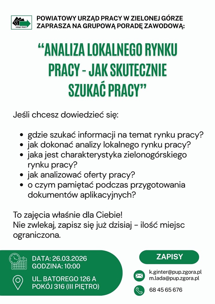 Powiatowy Urząd Pracy w Zielonej Górze zaprasza na grupową poradę zawodową, która odbędzie się 26.03.2026 r. o godzinie 10:00.