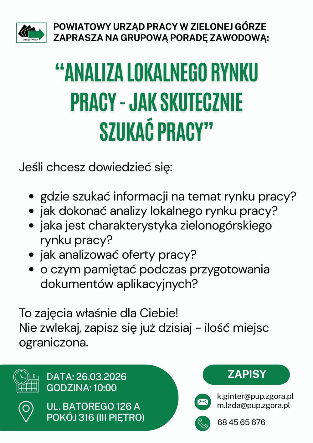 Powiatowy Urząd Pracy w Zielonej Górze zaprasza na grupową poradę zawodową "Analiza lokalnego rynku pracy - jak skutecznie szukać pracy".